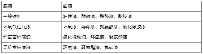 涂层结构形式一般有:底漆一中漆一面漆、底漆一面漆,底漆和面漆是同一种漆,一般不采用单一品种作为防护涂膜。底漆、中漆和面漆,经施工形成漆膜后,起的作用各不相同。